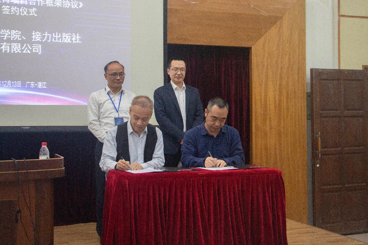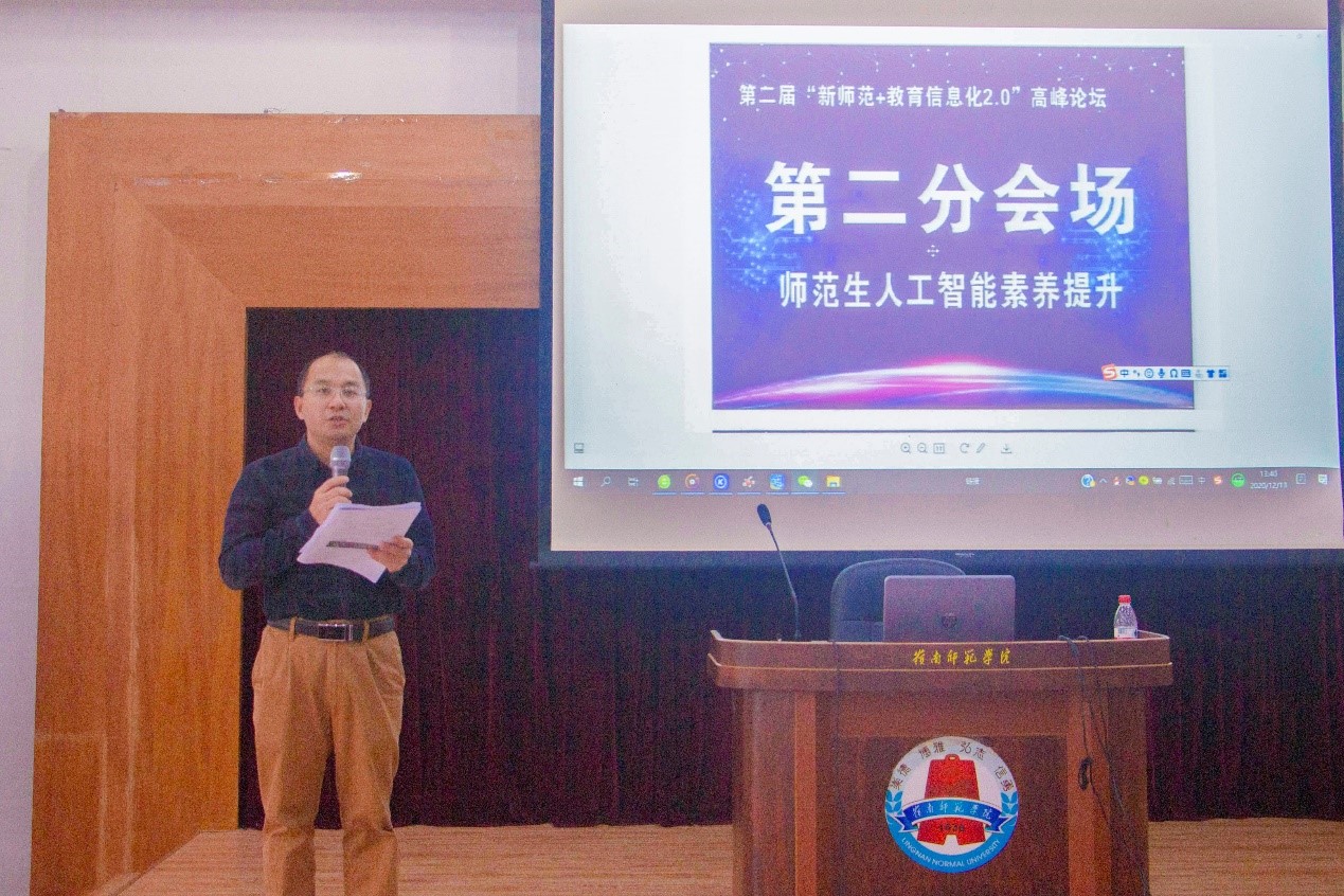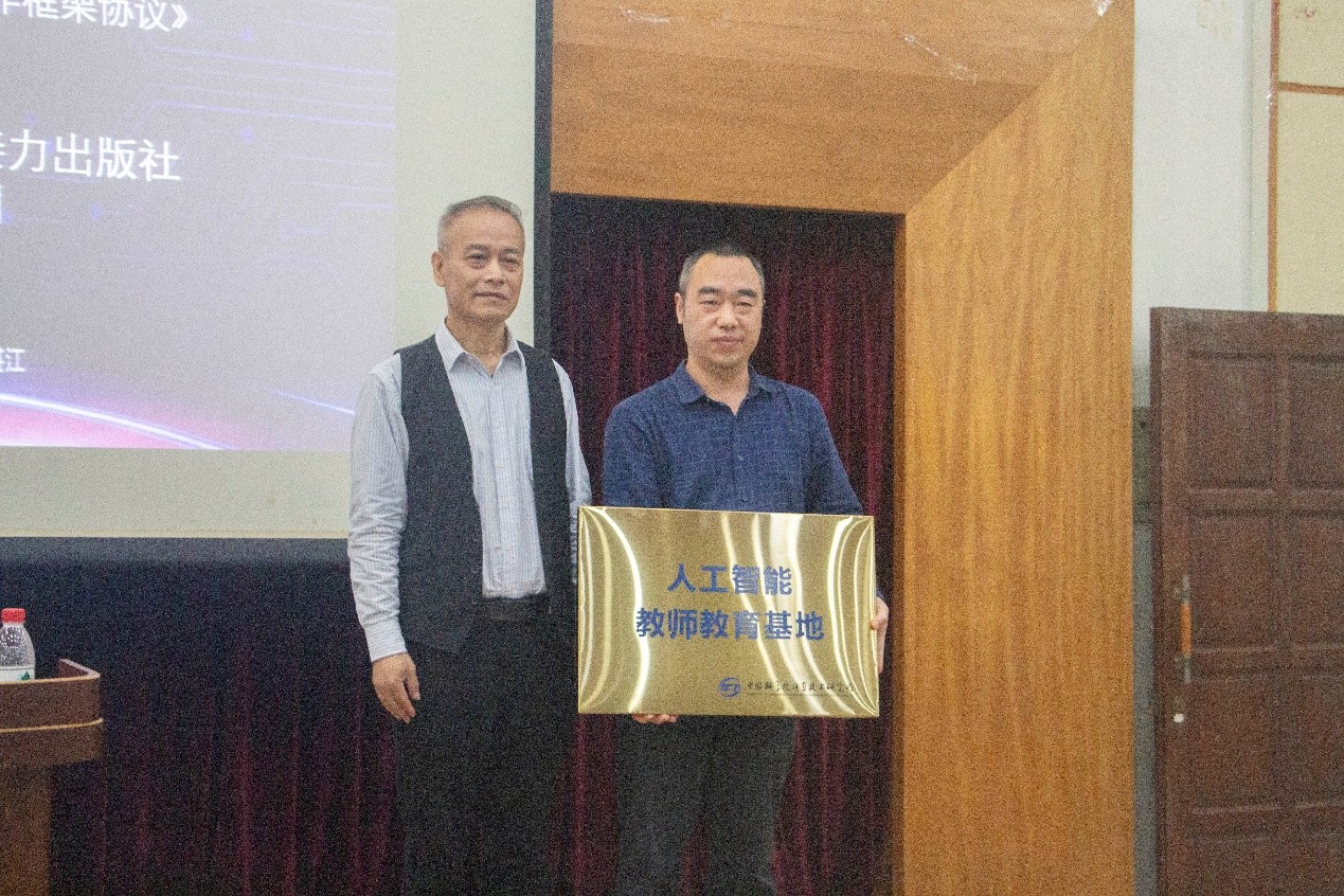 会议期间,由华南师范大学副校长蒋达勇、岭南师范学院副校长金义富作为见证人,并由接力出版社为岭南师范学院信息工程学院颁发人工智能教师教育基地牌匾。此次颁发仪式,是对岭南师范学院培养教师能力的认可,祝愿岭南师范学院越办越好,为国家培养出更多、更优秀的教师。