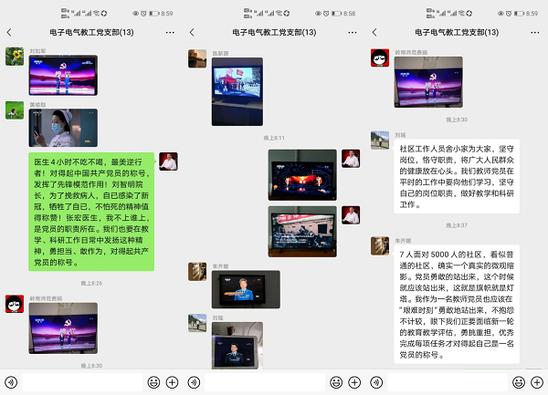 收看节目后,电子电气教工党支部党员刘瑶同志讲到,节目中生动画面真实地再现了来自各条战线上优秀共产党员和基层党组织,面对疫情,挺身而出、冲锋在前、临危不惧的英雄本色,是当前开展党史学习教育的生动教材。作为高校教育工作者,我们要在进一步正确认识自己身处的特殊地位和重要作用,不断学习贯彻习近平总书记关于教育的重要论述精神,以新担当新作为做好教学和科研工作,推动学院和学校教育教学科研工作高质量发展。