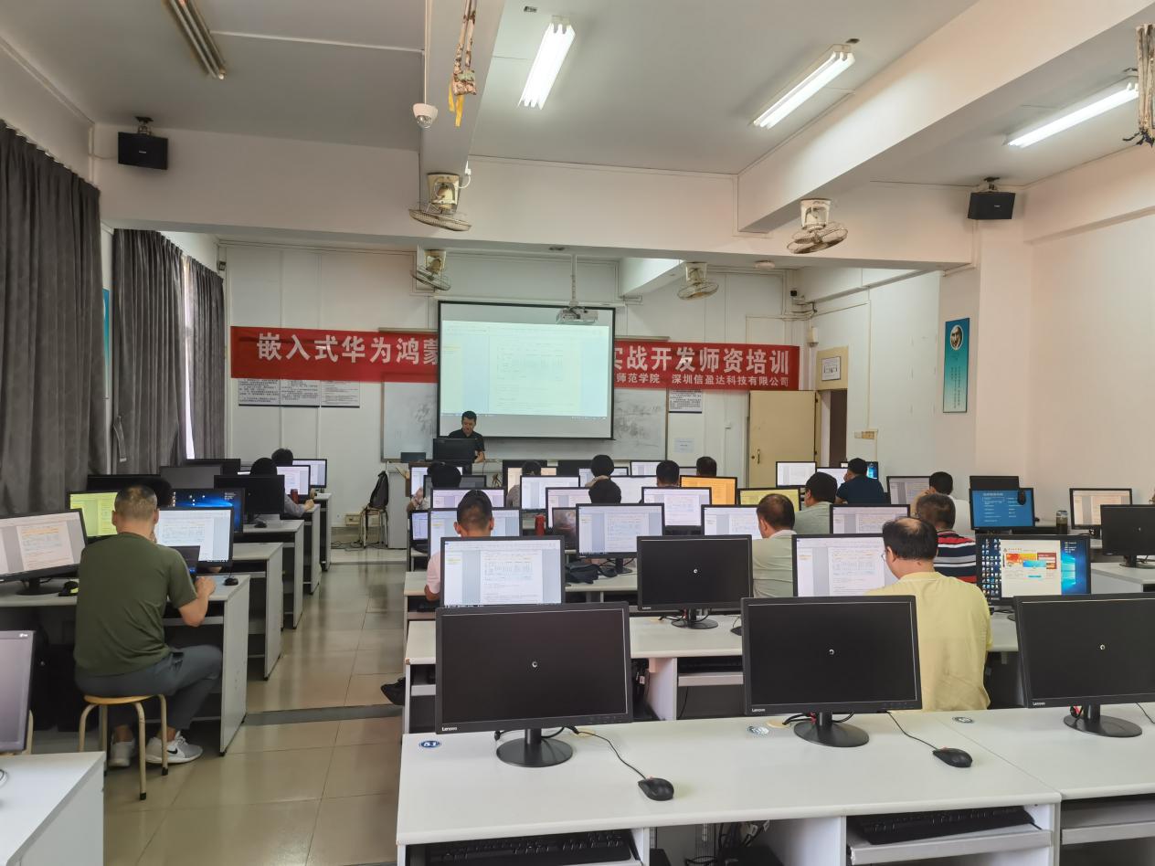 为推动《移动应用开发》、《操作系统》、《物联网开发》等课程改革,建设HarmonyOS高校人才生态、全面提升专业建设水平,2021年7月6日,杨俊杰院长带领物联网、计算机科学与技术、电子、电信专业的20余位教师,参加了深圳信盈达为期一周的“嵌入式华为鸿蒙操作系统项目实战开发师资培训”,加深了高校教师对HarmonyOS的理解。