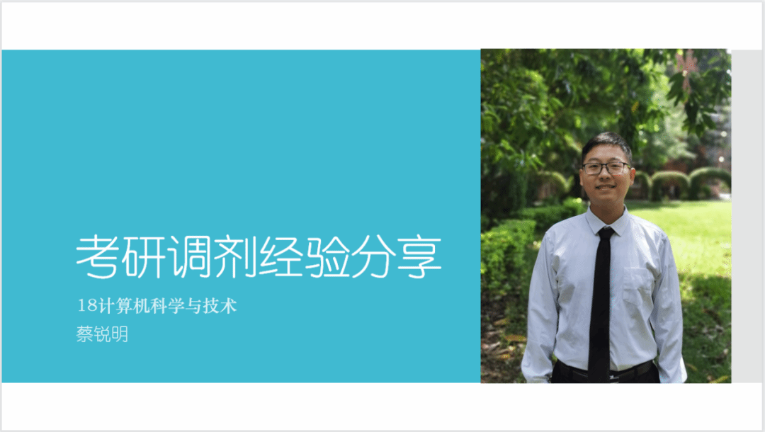 分享会上,现就读于广州大学的蔡锐明校友从复试准备、调剂方向、如何择校及信念支持等方面提供了诸多建议。他认为一定要根据自身的情况尽快做出选择,并要珍惜调剂的机会,不要因为犹豫不决错过调剂的时机。他以自身调剂成功上岸的经历为切入点,向同学们介绍了初试低分进行调剂的重要性与可行性,同学们务必保持良好心态,吸取经验成功上岸。