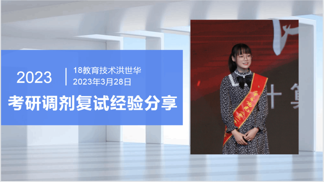 现就读于佛山科学技术学院的洪世华校友从调剂院校选择、复试过程中专业英语、专业课程、专业热点准备几个方面的经验进行了分享。她强调了前期应当做好个人简历、中英文的自我介绍、专业知识储备、邮件模板等准备工作的重要性,要适当了解导师的研究方向。两位校友表示,不论是在复试中还是在简历中,要突出自己的优点,坚持实事求是。复试中考官不仅考察学生们是否拥有扎实充足的专业知识储备、顽强拼搏的学习毅力,还考察学生们其他各个方面的综合能力。