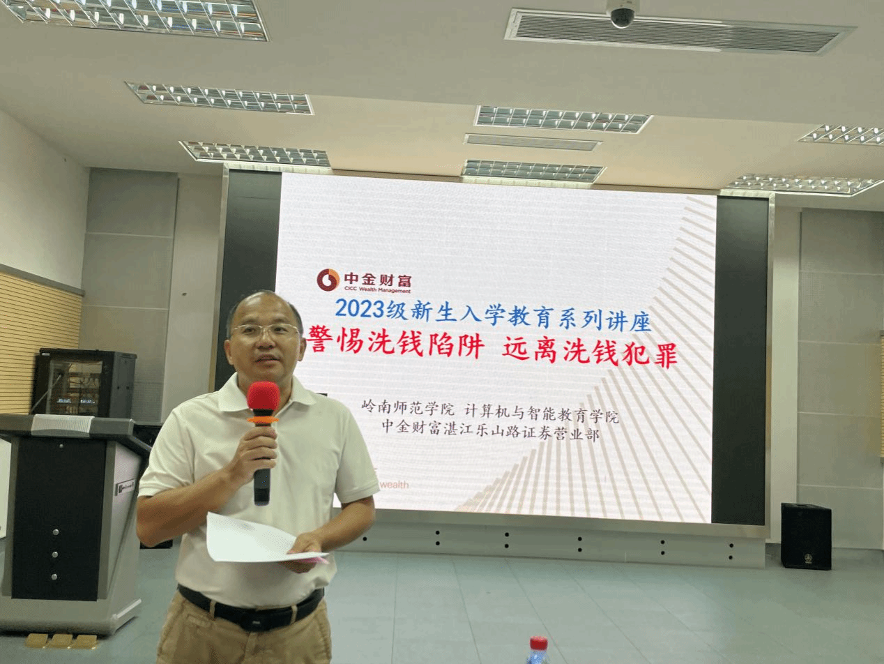 为了提高广大大学生的洗钱风险识别和防范能力,9月27日晚,计算机与智能教育学院在雷阳楼B栋802开展了以“警惕洗钱陷阱,远离洗钱犯罪”为主题的讲座。学院副院长张子石,中国中金财富证券有限公司湛江营业部合规总监兼反洗钱工作组副组长张虹,高级投资经理(VP)李美志,内训师陈永强,反洗钱工作组成员吴金玉,学院辅导员倪光睿及2023级新生代表参与此次活动。此次活动由张子石副院长主持。