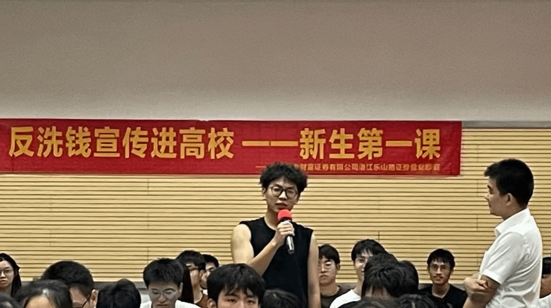 整个宣讲流程从师生签到开始,分别发放相关宣传资料,播放宣传短片等。主持人介绍嘉宾之后,中国中金财富证券有限公司湛江营业部工作人员对大学生们的到来表示欢迎,并且强调了洗钱犯罪的危害性。他们指出,洗钱是一种非法行为,不仅伤害社会公共利益,更将损害个人及家庭财产安全和荣誉形象,因此,预防洗钱是每个人的义务和责任。