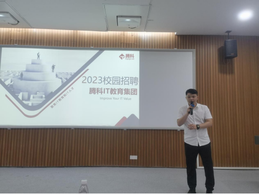 广州腾科网络技术有限公司经理陈聪就腾科教育集团的发展、企业文化、业务范围、市场竞争力等企业概况进行详细介绍,讲解了企业招聘计划、岗位职责、职业发展、薪资待遇和招聘政策,并向同学们讲解了如何注册使用腾科集团旗下的招聘平台以及招聘流程
