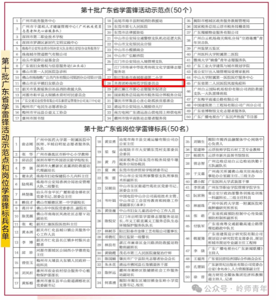 三月春风处处暖,雷锋精神代代传。在全国第61个“学雷锋纪念日”到来之际,3月5日,中共广东省委宣传部命名了第十批50个广东学雷锋活动示范点和50名岗位学雷锋标兵。共青团岭南师范学院委员会光荣入选本批“广东省学雷锋活动示范点”,这是继2023年荣获“中国青年志愿者优秀组织奖”“湛江市最佳志愿服务组织”以来的又一殊荣。