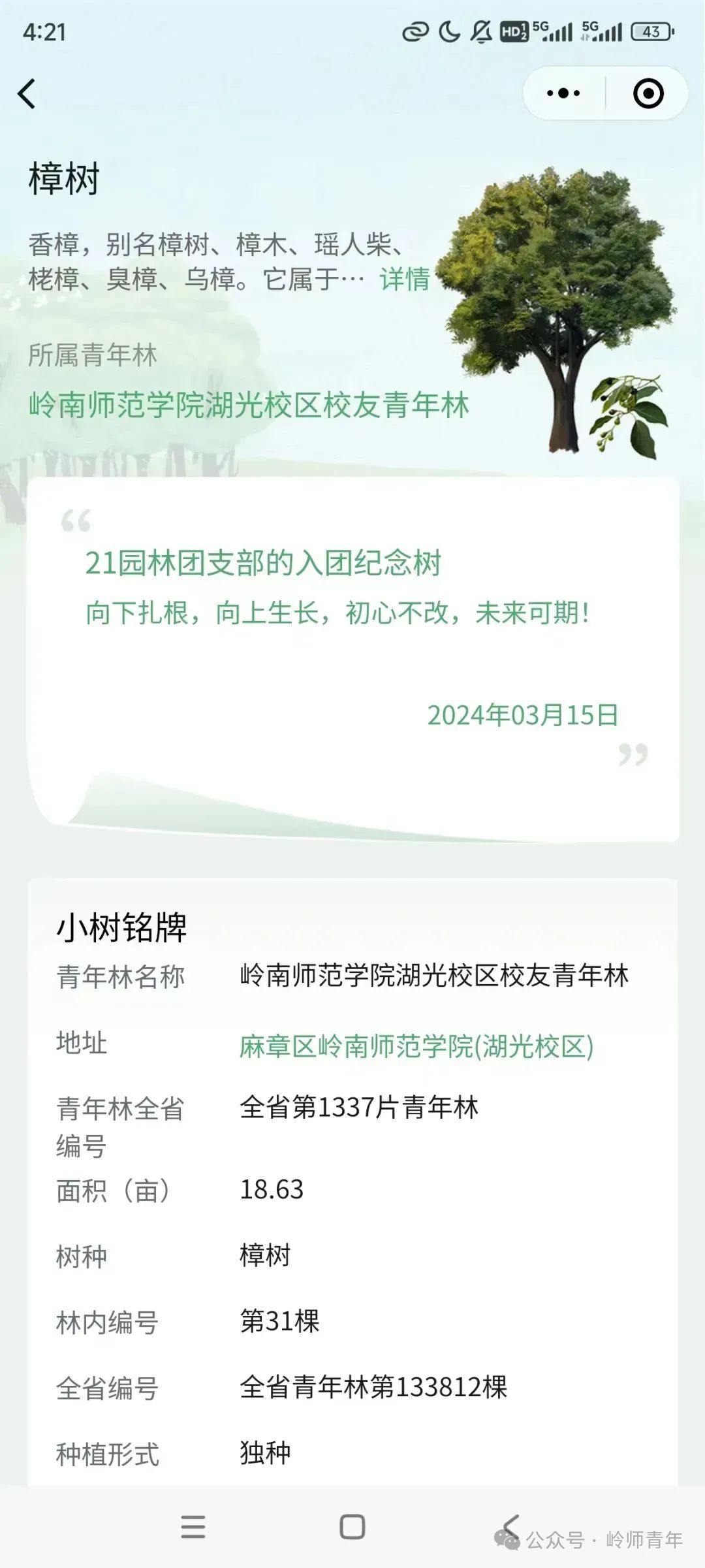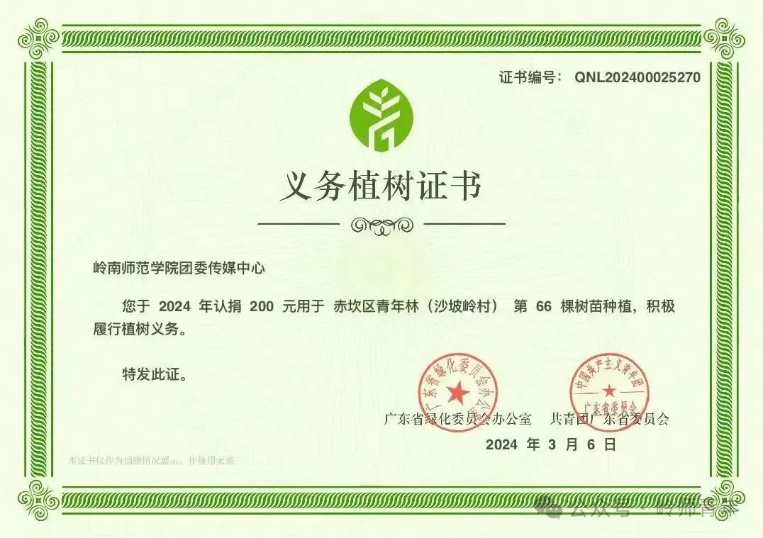 近日,广东“绿美青年林”小程序正式上线,岭师青年纷纷在线上认种认捐树苗。其中,认种是通过线上报名参加现场植树志愿活动,认捐是通过捐款购买树苗,种下属于自己的一棵树,也可以报名参加现场植树志愿活动。