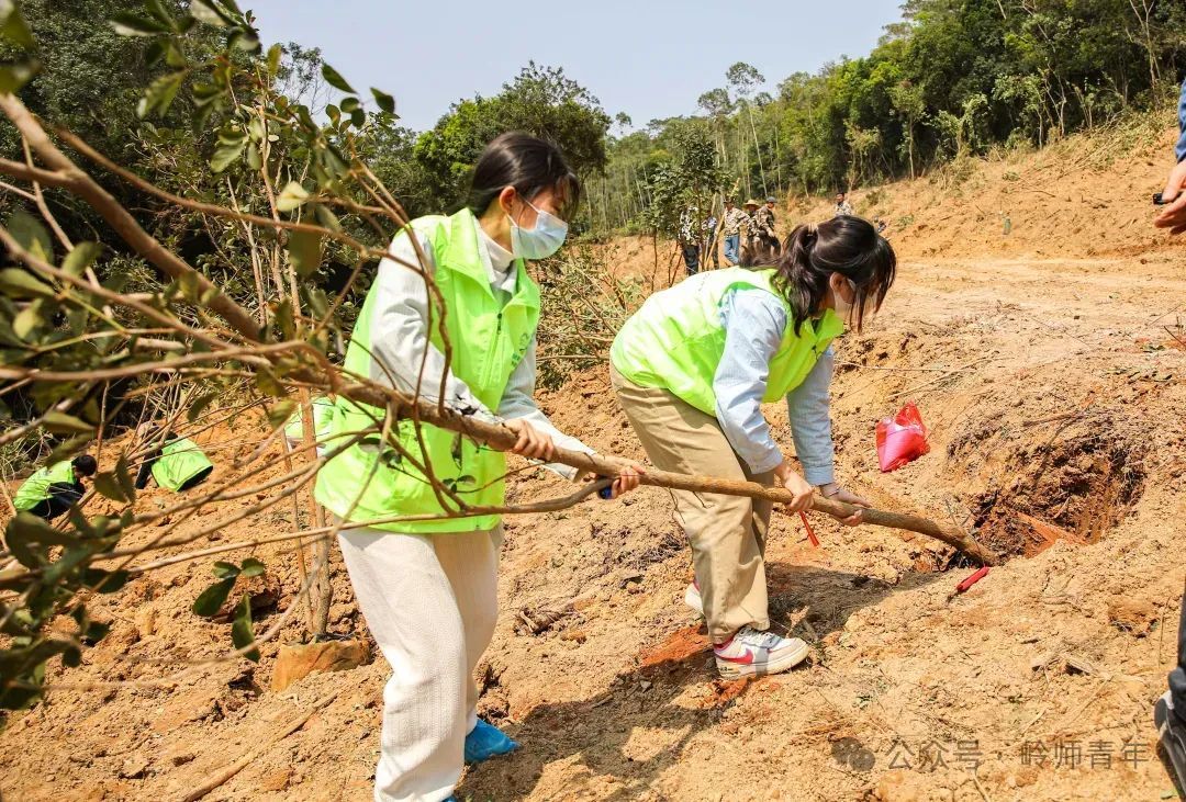 3月12日植树节当天,学校百名青年志愿者分别赴学校湖光校区、廉江市石城镇大岭山森林公园、麻章城家内村参加植树活动,种下小叶紫薇、黄花风铃木、香樟、桂花、红豆杉、银杏等不同品种共500多棵树木。