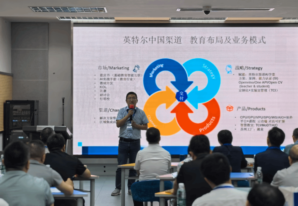 英特尔(中国)有限公司华南区行业总监徐飞飞,针对“推动产学合作,共赴数智未来”作了主题分享,介绍了英特尔在中国人工智能教育领域的发展策略和业务模式,以及英特尔赋能AI教育,推动产学合作,助力AI人才培养。