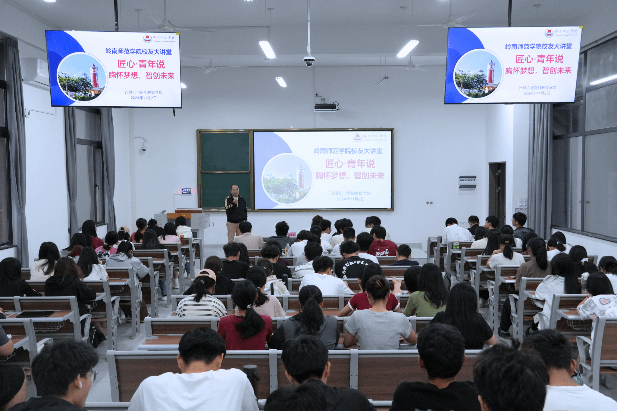 为凝聚校友力量,共话学院发展,树立优秀榜样助力学生成长成才,计算机与智能教育学院于11月2日,在学校湖光校区笃学楼103举行了“匠心青年说 • 胸怀理想,智创未来”专题报告。本次活动邀请2008届校友魏朝仪作为主讲嘉宾。学院党委副书记陈明娟、副院长张子石、辅导员周东方晨以及2024级教育技术学专业全体学生参加。