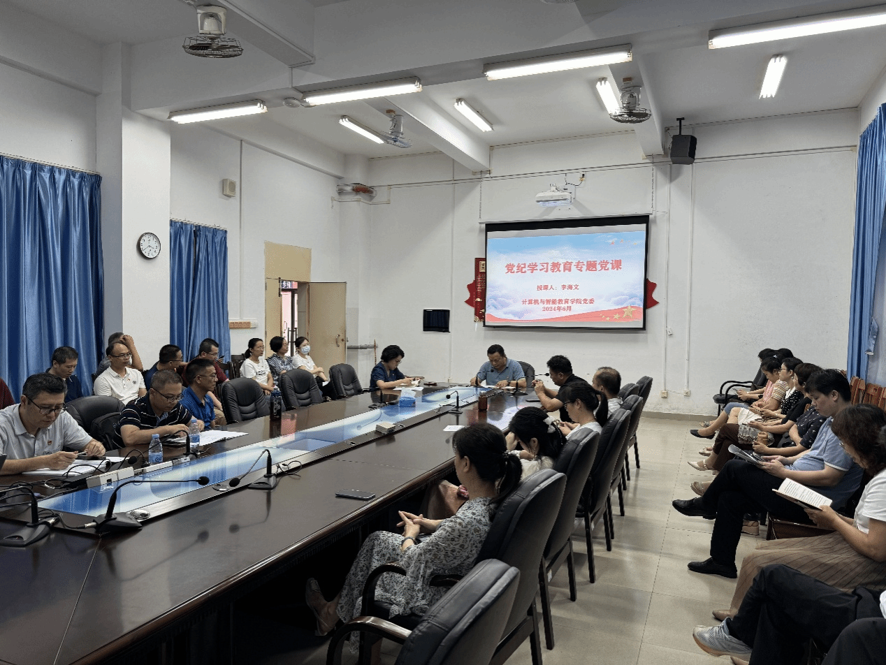 为深入贯彻党中央关于开展党纪学习教育的决策部署,6月12日,计算机与智能教育学院党委书记李海文在综B101会议室为学院全体教职工党员上了一堂生动的党纪学习教育专题党课。本次党课以新修订的《中国共产党纪律处分条例》为指导,结合学院实际,对全体党员进行了一次深刻的党性教育和纪律教育。