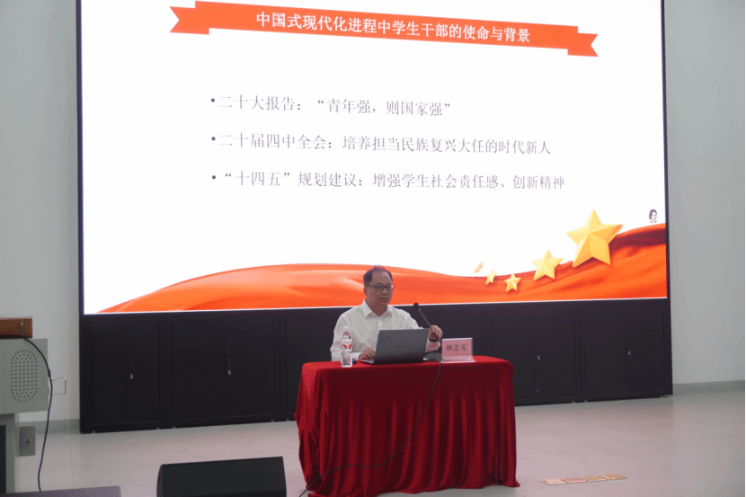随后,林志军部长以《新时代学生干部应具备的素质能力和工作方法》为题,为学生干部的未来发展指明方向。他结合党的二十届四中全会精神强调,学生工作应紧密结合“问题导向、团队协作、数字化工具应用、实践育人”四大方向,以创新方法践行责任担当。林志军希望全体学生干部以全会精神为指引,持续提升综合素质、优化工作方法,争做同学信赖的“贴心人”和学校发展的“生力军”,为培养德智体美劳全面发展的社会主义建设者和接班人贡献力量。