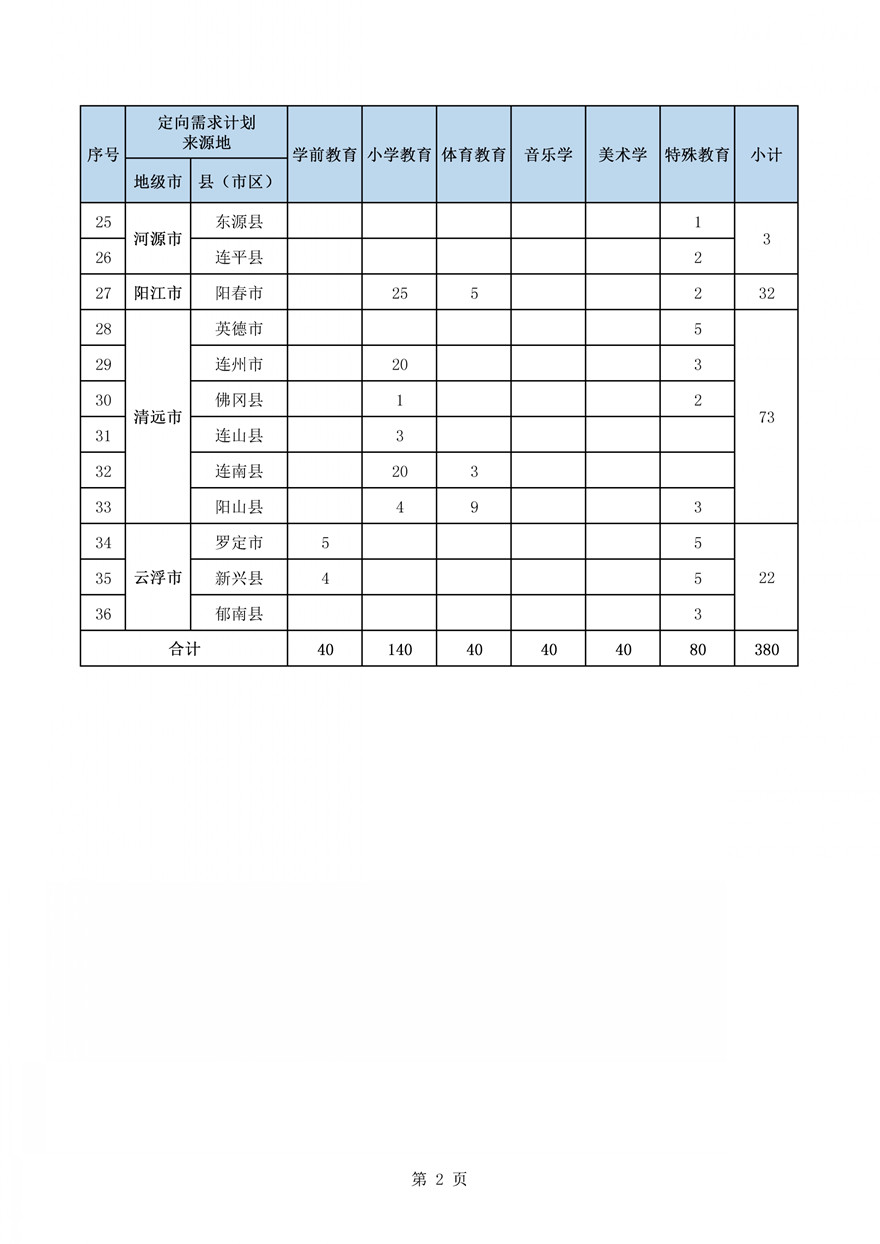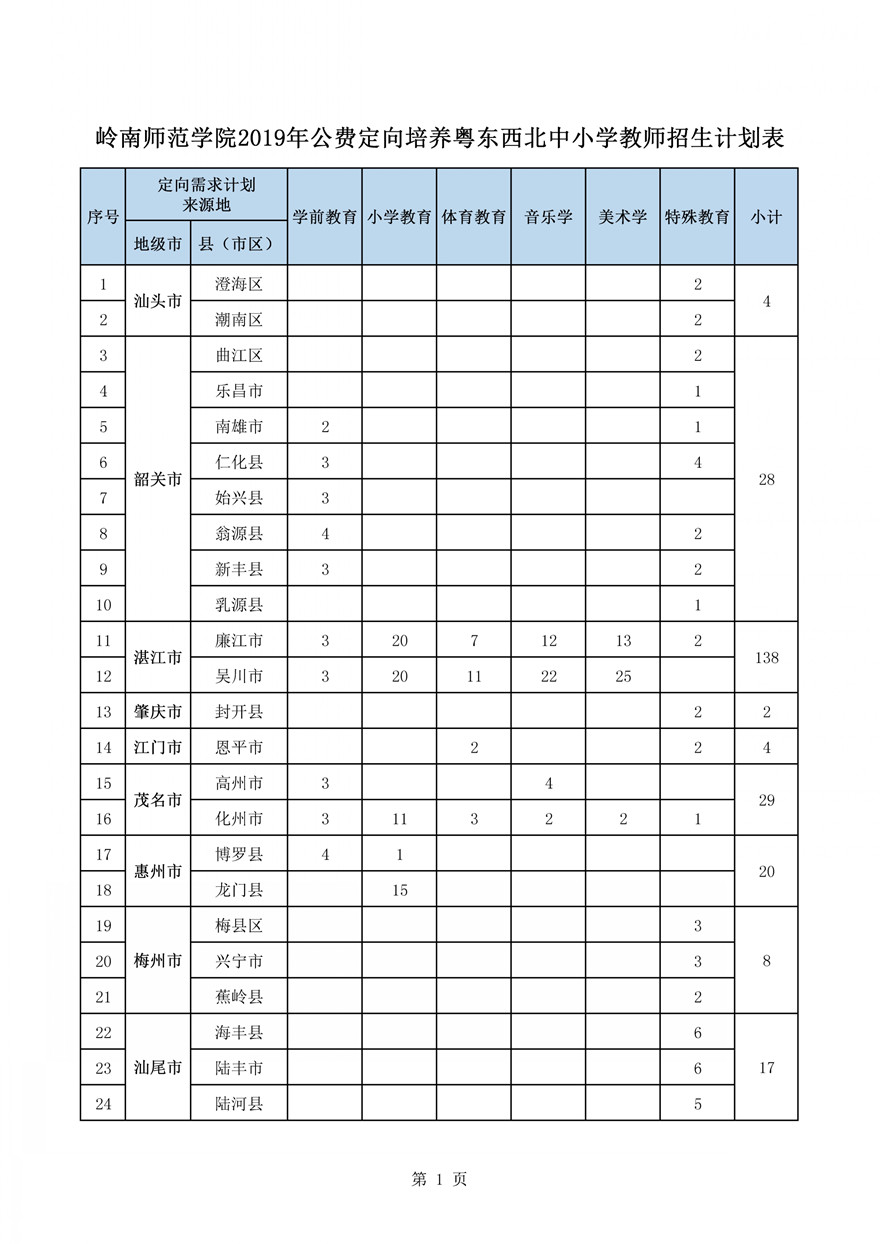 岭南师范学院2019年公费定向培养粤东西北中小学教师招生计划表