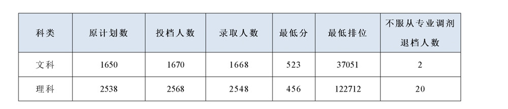 我校文科原计划1650人,调入20个预留计划投档,投档1670人,投档分为523分(最低排位37051),比省控线高68分;理科原计划2538人,调入30个预留计划投档,投档2568人,投档分为456分(最低排位122712),比省控线高66分。文科录取最高分为552分,最高排位16791;理科录取最高分为518分,最高排位53989;文科有12人、理科有87人超过高分优先投档线。文理科投档我校并服从专业调剂的考生全部录取,共有22人因所报专业无法录取并且不服从调剂的考生均退档。