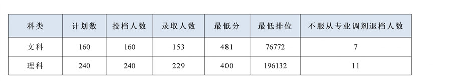 广东省2019年专科批文理科于2019年8月1日投档,我校的文科投档分为481分(最低排位76772),原计划160人,投档160人;理科投档分为400分(最低排位196132),原计划240人,投档240人。文理科投档我校并服从专业调剂的考生全部录取,共有18人因所报专业无法录取并且不服从调剂的考生均退档。我校专科批文理科投档录取详情如下表: