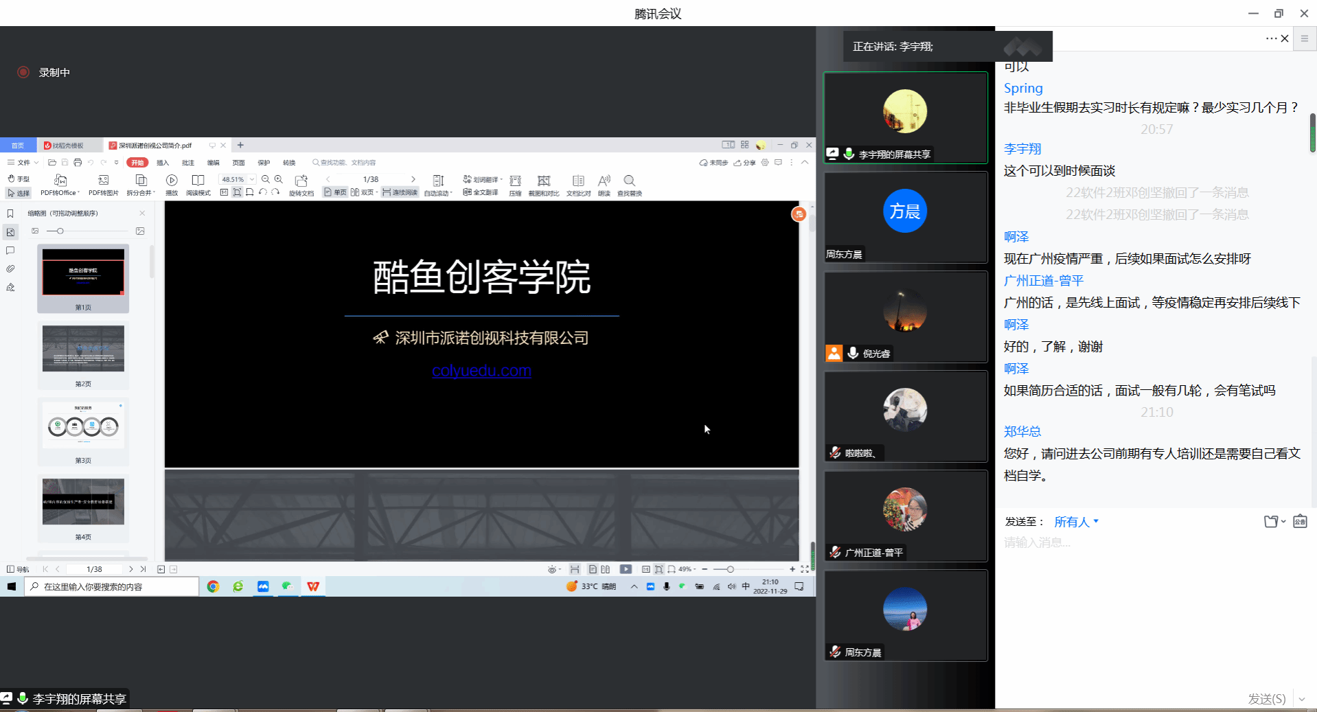 宣讲会上,人事总监熊磊从公司发展历程、行业前景与人才招聘计划,同时以自身的工作经验为在场的同学们做了详细的介绍,带领同学们全面了解派诺创视科技的发展历程、主要业务、岗位需求、发展前景等信息。同学们针对自己感兴趣的问题与企业进行线上交流沟通,主动了解用人单位的基本情况并表达自己的求职意向,企业对毕业生的就业疑惑进行了详细的解答。