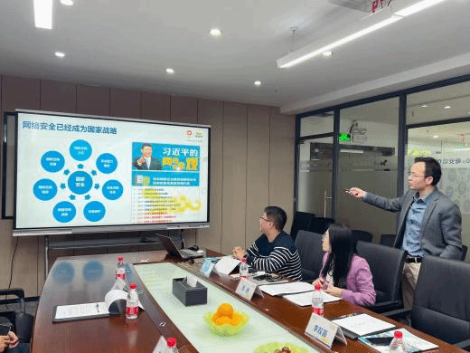 11月17日上午,李海文一行赴奇安信安全技术(广东)有限公司开展“访企拓岗促就业”活动。公司市场总监李双喜介绍了公司发展历史、规模和未来发展规划,并详细介绍了奇安信实战化网络安全人才培养方案,包括产业发展趋势、安全人才现状、深度产教融合建设、校企合作内容及案例等内容。校企双方重点就产教融合网络安全产业学院进行了详细讨论,对校企合作办班、人才培养模式、人才培养方案、教材建设和资源建设等方面进行了深入交流。随后,参观了广东技术师范大学网络空间安全学院(广东省教育行业网络靶场与实网攻防演练中心),就网络安全人才培养工作进行了深入探讨和交流。