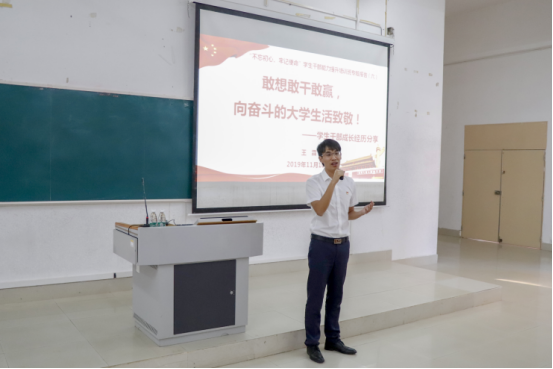 “敢想敢干敢赢,向奋斗的大学生活致敬。”校友王霖分享了他担任学生干部的成长经历。两次参加创业竞赛挑战杯的经历,更好的锻炼了他的能力,也使他明白了敢于表现,才能被发现。他告诉我们努力工作,好事自然而然会降临;相信困难并不是真实存在的,是我们想象出来的;相信努力向前,会有更好的未来。