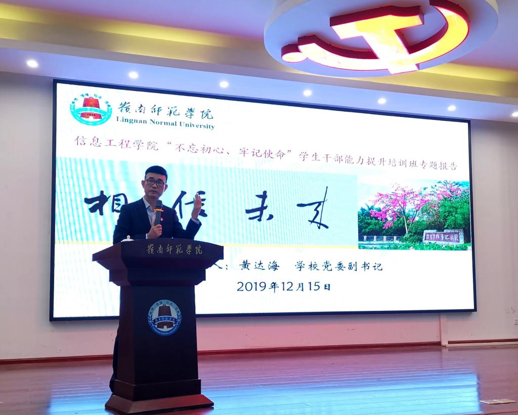 12月15日下午,学校党委副书记黄达海应邀为信息工程学院“不忘初心、牢记使命” 学生干部能力提升培训班作题为《相信未来》的专题报告。信息工程学院党委书记林汉、党委副书记陈明娟、副处级组织员温响东、全体辅导员及全体学生干部300余人到场聆听。