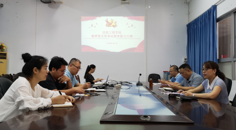 为进一步贯彻落实省委教育工委《关于开展全省高校教师党支部书记素质能力大赛的通知》和岭南师范学院《关于开展教师党支部书记素质能力大赛的通知》,2020年7月17日上午,信息工程学院举办教师党支部书记素质能力大赛,学院党委书记李海文、党委副书记陈明娟、副院长洪伟铭以及各教工党支部书记等参加了此次活动。