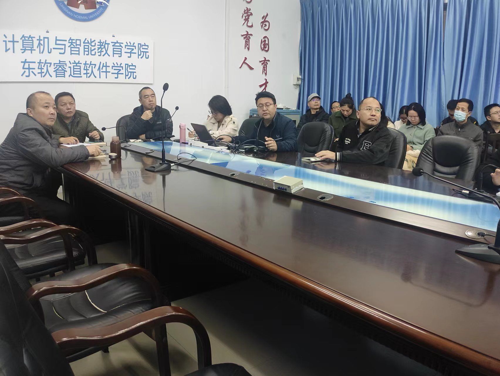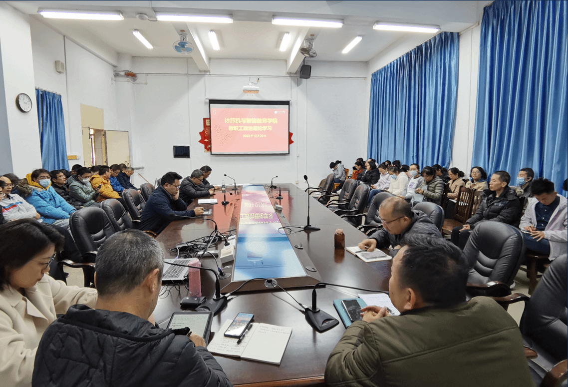 12月20日,计算机与智能教育学院于综合实验楼楼B栋 101 会议室召开全体教职工大会。会议由学院党委书记李海文主持,围绕国内外形势与政策专题开展了2023年第八次政治理论学习。