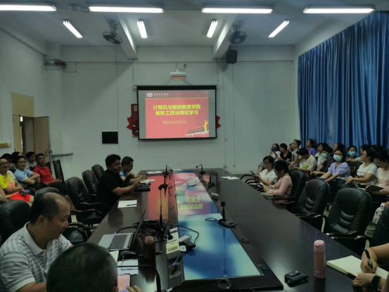 2023年9月2日,计算机与智能教育学院在综合实验楼B栋101会议室召开了全体教职工大会,专题学习习近平总书记关于教育、科技、人才的重要论述,会议由李海文书记主持。