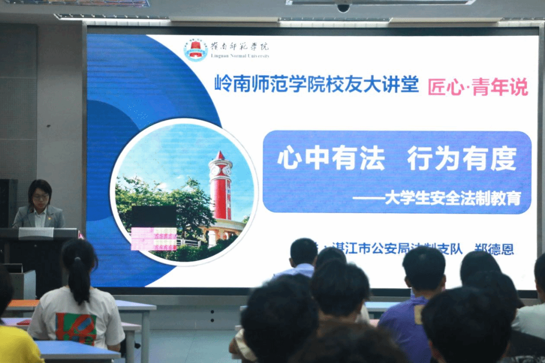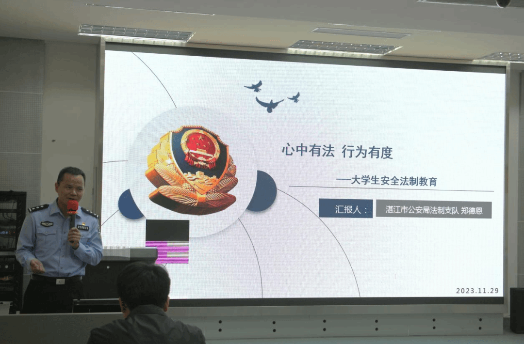 为深入贯彻落实党的二十大精神,加快建设法治社会,弘扬社会主义法治精神,进一步增强大学生的法治观念和法律意识,11月29日下午,计算机与智能教育学院在雷阳楼802课室举办“心中有法,行为有度”大学生安全法治教育专题报告。本次报告特别邀请了湛江市公安局法治支队四级警长、我校2015届法学专业毕业生郑德恩校友主讲。本次报告由学院党委副书记陈明娟主持。