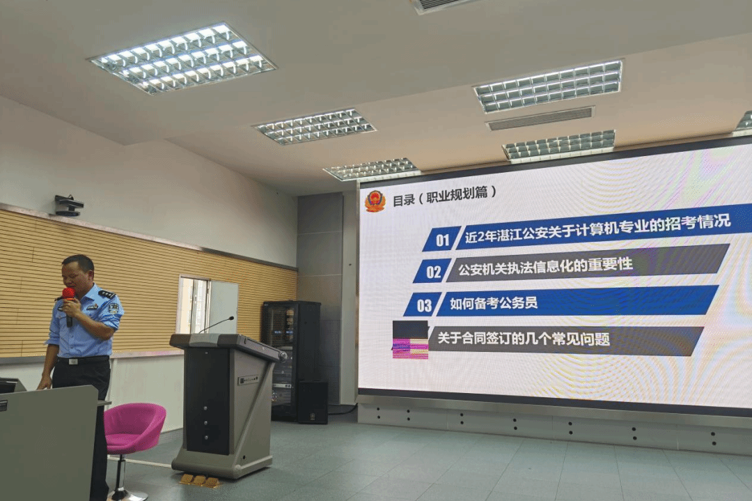 为切实推进学院就业工作高质量发展,帮助学生了解公务员考试政策和备考策略,11月29日下午,计算机与智能教育学院在雷阳楼802课室举办“计算机类大学生如何备考公安系统公务员”经验分享会。本次分享会特别邀请了湛江市公安局法制支队干警郑德恩,广州市公安局增城区分局干警、学院2020届校友朱梓通。本次会议由学院党委副书记陈明娟主持。