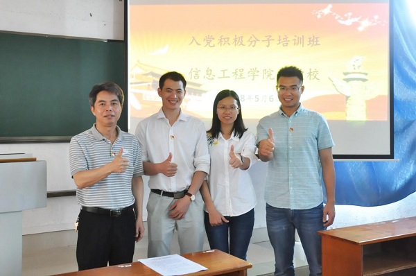 5月6日,信息工程学院分党校、体育科学学院分党校第一期入党积极分子培训班在弘雷楼603室举行。受信息工程学院分党校邀请,我校2014年成功考取哈尔滨工业大学硕士研究生、2017年成功创业的校友李康华和2018年成功考取中山大学硕士研究生的陈东平为入党积极分子们分享了他们的入党历程和大学学习的经验体会。