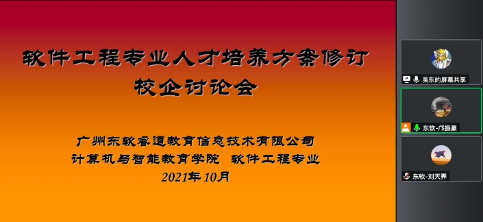 为进一步完善软件工程专业本科人才培养体系,全面提高人才培养质量,软件工程系跟合作企业广州东软睿道教育信息技术有限公司在2021年10月28日上午,召开了2022版人才培养方案修订校企讨论会。本次会议在线上举办,参会的有软件工程系专业教师、东软睿道技术总监刘天霁、东软睿道管理总监邝振豪。
