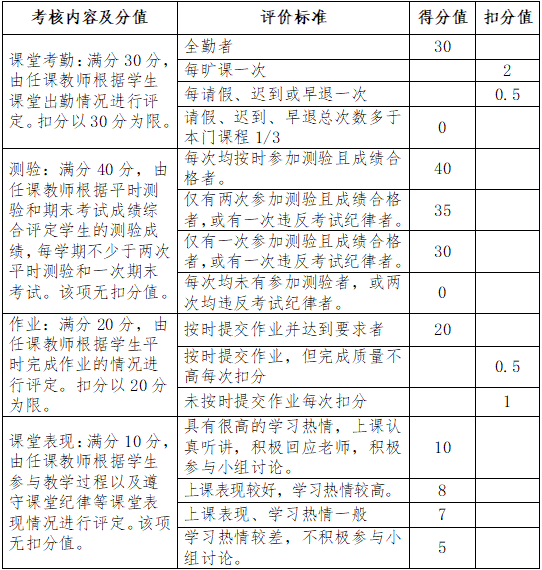 1.学习过程考核成绩按百分制计算,由任课教师根据课堂考勤、测验、作业和课堂表现四个方面综合评定。其中课堂考勤占30%,测验占40%,作业占20%,课堂表现占10%。得分值减去扣分值为该项考核分数(具体见下表)