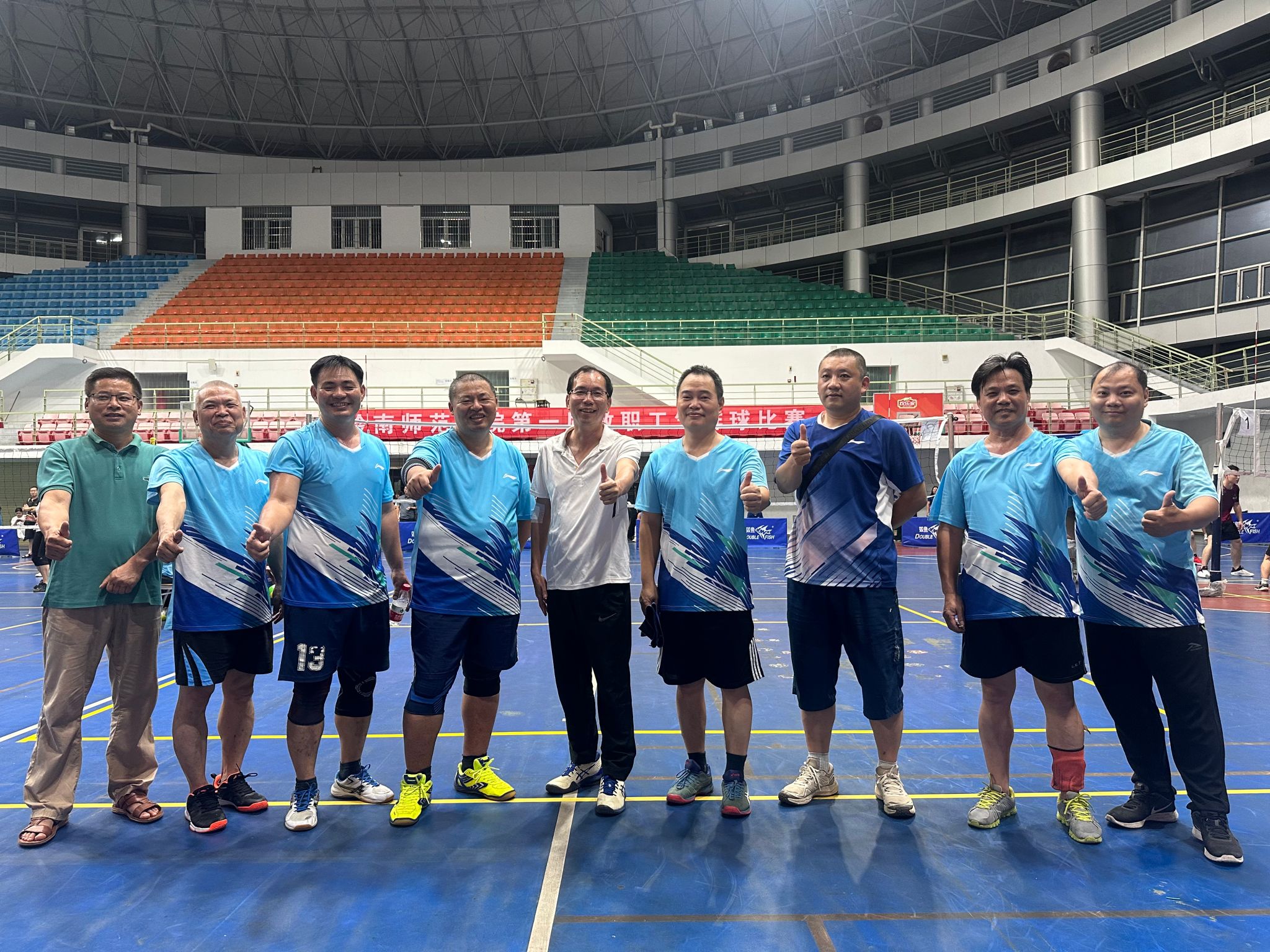 我院男教职工队伍则气势如虹,配合默契,发球、一传,二传、扣球……每个环节都尽力发挥,严谨认真,上演了一场场精彩绝伦的比赛,一路闯关顺利进入决赛。在决赛中对阵实力相当的对手也毫不畏惧,在第一次频频失分的劣势下能够迅速调整状态,重新排兵布阵,振作士气,在学院拉拉队热情洋溢的呐喊声中势如破竹,不断攻下一个个得分,最后成功夺冠。