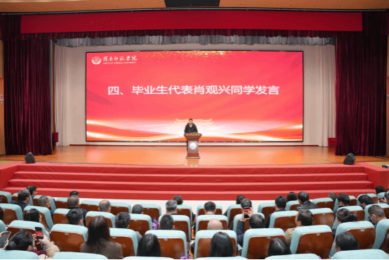 教师代表陈臻教授寄语同学们在未来的道路上要勇于担当、奋发图强。毕业生代表肖观兴在毕业典礼上分享了三年来的学习心得和感悟。