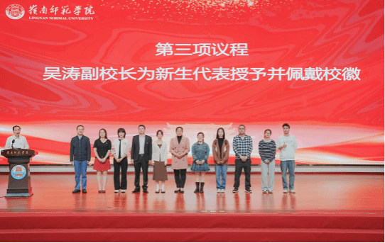 吴涛副校长为新生代表授予并佩戴校徽