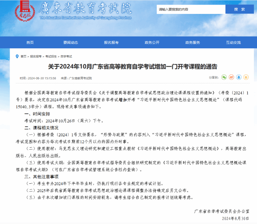 现转发广东省自学考试委员会办公室 《关于2024年10月广东省高等教育自学考试增加一门开考课程的通告》,具体内容详见截图,考生也可登录广东省教育考试院官网查询(https://eea.gd.gov.cn/zxks/content/post_4485694.html)。请广大考生知悉并结合自己制定的报考计划统筹考虑。