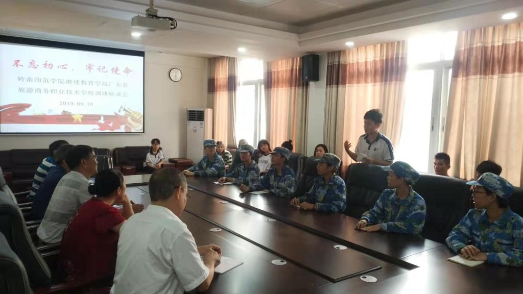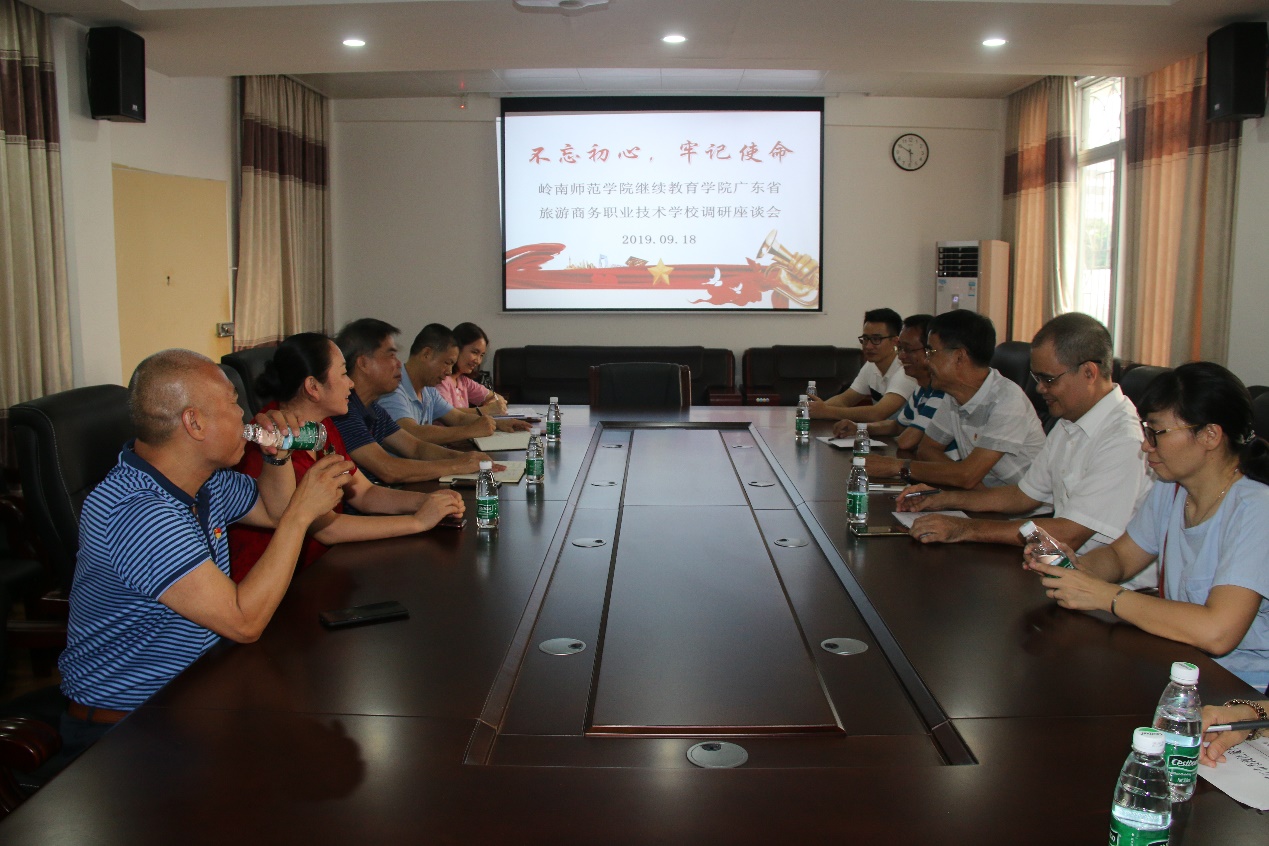 为了贯彻落实学校党委“不忘初心、牢记使命”主题教育动员部署会,切实回应好我校今年首批五年一贯制农村小学全科教师公费师范生(专科)学历提升的强烈愿望,近日,继续教育学院院长、学院主题教育领导小组组长王栋带领该学院副院长卢江、郭春才以及王正琦、周晓军、陈利、郭翠婷等科长一行7人,专程到广东省旅游商务职业技术学校(以下简称“省旅游学校”)进行调研。调研会由省旅游学校党委书记、校长吴万主持。省旅游学校副校长张妙龄、校办、招生办、总务科等工作人员以及2019级初中起点五年一贯制公费师范生代表参加了会议。