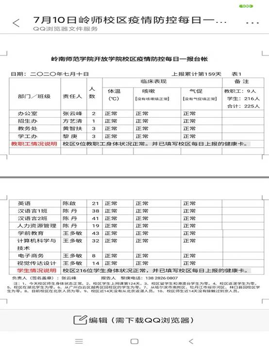 开放学院校区疫情防控每日一报台账截图(7月10日)