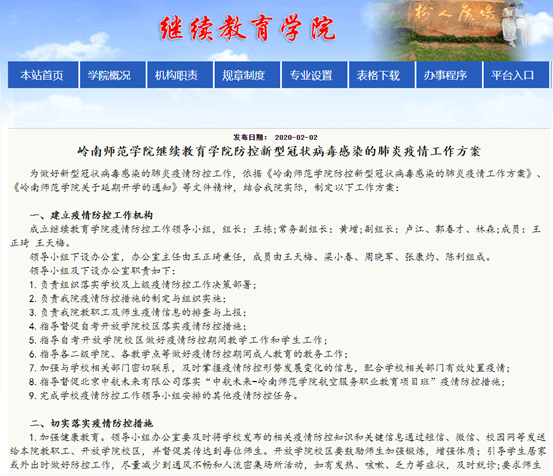 疫情发生后,继续教育学院党总支深入贯彻学校党委的部署,迅速行动,积极落实学校疫情防控工作,同时结合学院工作实际,第一时间出台《 岭南师范学院继续教育学院防控新型冠状病毒感染的肺炎疫情工作方案》、《 岭南师范学院继续教育学院关于疫情防控期间成教、自考和社会培训相关工作安排的通知》等相关细致方案,专门成立继续教育学院疫情防控工作领导小组,有针对性地制定疫情防控措施、明晰职责、分工和突发事件的处理机制,指导开放学院校区和中航未来航空服务项目班的疫情防控,做好疫情期间师生的管理工作。