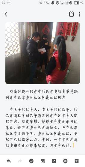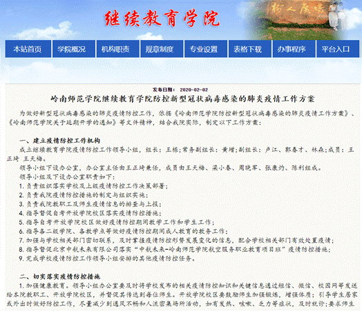 疫情发生后,继续教育学院党总支深入贯彻学校党委的部署,迅速行动,积极落实学校疫情防控工作,同时结合学院工作实际,第一时间出台《岭南师范学院继续教育学院防控新型冠状病毒感染的肺炎疫情工作方案》、《岭南师范学院继续教育学院关于疫情防控期间成教、自考和社会培训相关工作安排的通知》等相关细致方案,专门成立继续教育学院疫情防控工作领导小组,有针对性地制定疫情防控措施、明晰职责、分工和突发事件的处理机制,指导开放学院校区和中航未来航空服务项目班的疫情防控,做好疫情期间师生的管理工作,结合疫情形势,组织学生开展抗疫宣传、主题团日等活动。