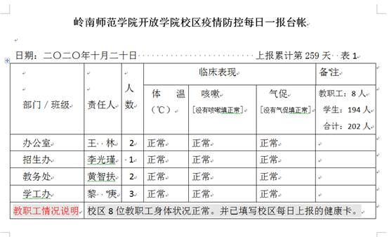在学校疫情防控办的指导和学院疫情防控工作领导小组的领导下,各科室同仁立足本职工作,积极参与“抗疫”。学生科、办公室每日紧盯本院教职工、开放学院校区、中航未来航空服务项目班的师生每日健康打卡、疫情信息的排查、统计、上报统计工作至今,从未中断。即使是深夜12点,只要有一名学生健康情况未落实,也一定要确认清楚。从排查湖北籍人员,到排查浙江、广州、深圳人员,再到排查黑龙江、吉林人员,以及后来排查北京人员,学生科、办公室工作细致、严谨,务必确认到每一名师生健康、不轻易放过任何一处疑点。从今年2月至今,开放学院校区和中航未来航空服务项目班的学生已坚持每日健康打卡259天,从未中断1天,也从未发生疫情感染等不安全事项。