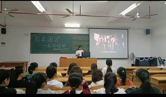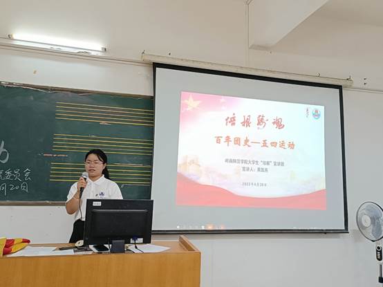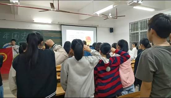 活动伊始,同学们观看爱国主义电影《我的1919》,对五四运动背景和经过有了初步的了解与认识。黄凯燕对五四运动、五四精神及其历史意义进行了阐述,宣讲中带着大家提问互动回顾中国共产主义青年团的发展历程,并在过程中重温入团誓词,以视、听、互动等方式营造沉浸式的学习体验,加强同学们的情感共鸣,让同学们深刻领悟中国青年强烈的爱国情怀。