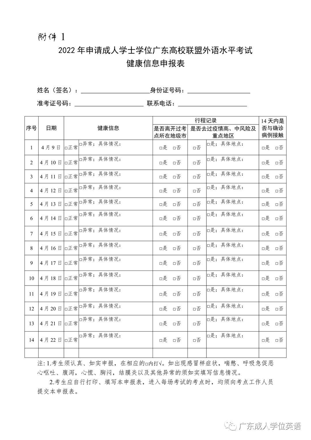 二、考生须进行考前14天自我健康观察,每日如实填写考前14天个人健康信息申报表(见附件1),并在参加考试时提交考点工作人员。