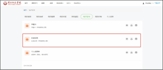 (2)在【电子证书】中选择“在读证明”,可预览、下载、在线打印电子证明。