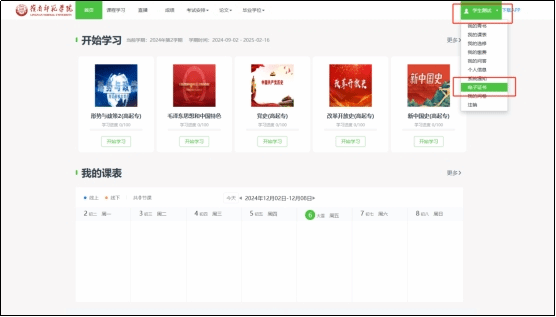 (1)登录账号后,在首页点击学生姓名,选择【电子证书】。