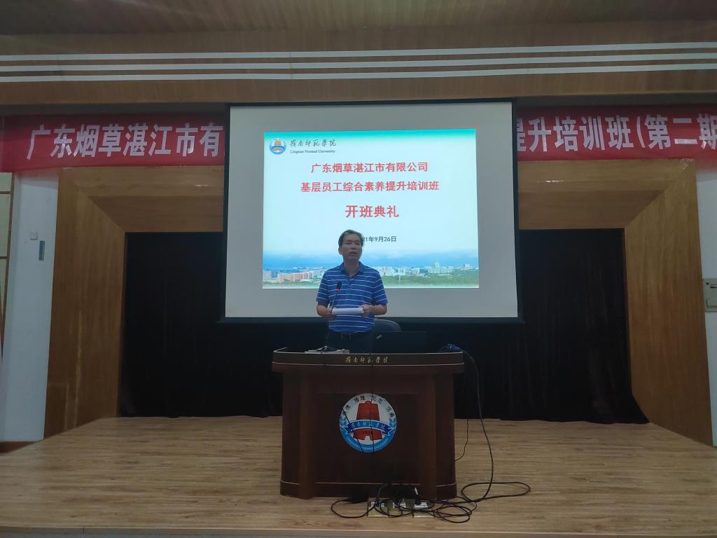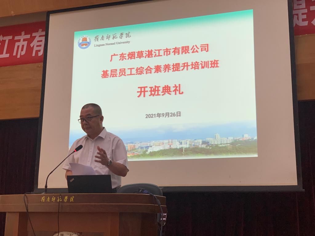 9月26日,广东烟草湛江市有限公司基层员工综合素养提升培训班(第二期)开班仪式在我校图书馆学术报告厅举行。湛江市烟草专卖局(公司)党组成员、副局长陈德明,人事科科长李士林,我校继续教育学院党总支书记、院长曹巧,副院长巫智慧等相关负责人以及培训班学员出席了开班仪式。开班仪式由巫智慧主持。