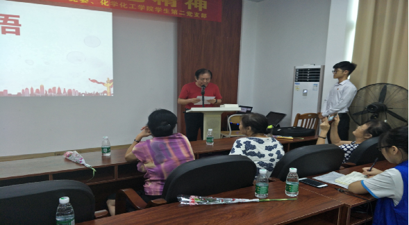 赤坎区关工委田欣民同志作为老党员代表讲述了他个人的蓝天梦,认为每个红军战士都有坚定的信念去克服一切的困难,希望每个青年人要从小立志,树立坚定的信念,要有艰苦奋斗精神和高尚的品德,把红军精神的接力棒一代一代地传承下去。接着,化学化工学院学生第二党支部的朱冰同志也分享了她的青春梦。她表示以后会更加坚定自己的梦想,以身作则,更加严格要求自己,用科学文化知识来巩固中国梦。为了进一步弘扬红色精神,他们组织了传苹果,唱红歌的小游戏,一首首经典的红歌萦绕在整个会议室。老党员温汉宏同志则朗诵了革命老党员冷少农给儿子的一封“红色”家书。他希望青年党员们从家书中汲取营养,不忘初心、继续前进,完成好这一代共产党员的使命。随后,青年党员廖家文同志也朗诵了老一辈革命家朱德给前妻的一封“红色”家书。她表示作为共产党人要继承烈士遗志,不忘入党初心、坚定理想信念、立足本职、扎实工作,为了实现中国梦贡献自己的力量。全体党员与积极分子在卡片上写下对老党员的感谢与祝福及在老党员邓明同志的带领下,重温入党誓词。