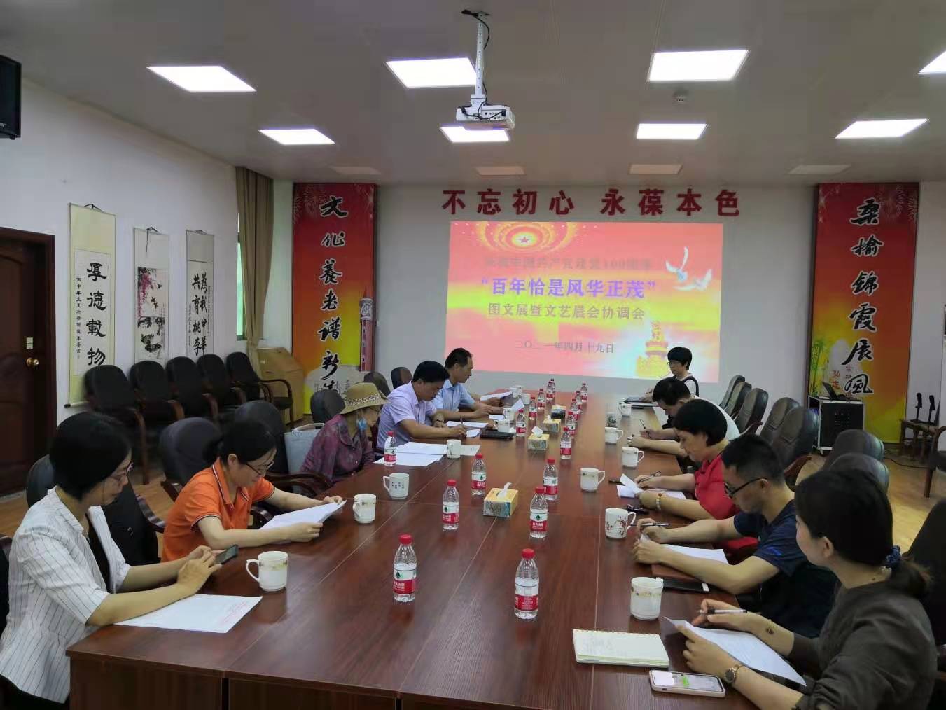 为庆祝中国共产党建党100周年,根据学校党史学习教育安排,4月19日下午,我校“百年恰是风华正茂”图文展暨文艺晨会工作协调会在离退休人员服务中心会议室召开。会议由学校党委委员、宣传部部长刘坤章主持,校党委组织部、校党委宣传部、离退休人员服务中心、关心下一代工作委员会、校团委、党委学生工作部、规划与法规处、安全保卫处、数学与统计学院、美术与设计学院、音乐与舞蹈学院、幼儿园等单位的相关负责人出席了会议。