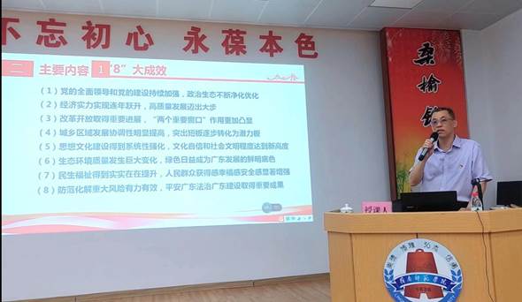 付继发主要围绕“重要意义、主要内容、狠抓落实和结合工作学习贯彻”等四个方面对省第十三次党代会的主要精神作了深入浅出的宣讲辅导。他指出,大会是一次坚持以习近平新时代中国特色社会主义思想为指导,忠诚拥护“两个确立”、坚决做到“两个维护”,紧跟总书记、奋进新征程的大会,是一次统一思想、凝心聚力、求真务实、风清气正的大会,对广东当前和今后一个时期的发展具有重要意义。他强调,新起点,新征程,新的赶考之路,尤须牢记总书记殷殷嘱托,不断深化对加强党的全面领导和党的建设作为“1+1+9”工作部署第一个“1”的首要地位和引领作用的认识,深刻领悟加强党的全面领导和党的建设是做好第二个“1”以及“9”的根本保证,是应对未来各种挑战、战胜一切困难和风险的根本保证。要着眼于新的形势和要求,始终牢记习近平总书记的殷殷嘱托,以更高要求推进全面从严治党,坚持严的主基调不动摇,加固中央八项规定精神堤坝,推动全面从严治党向基层延伸,一本推进不敢腐、不能腐、不想腐。结合学校纪检监察工作实际,他在分析高校和我校党风廉政建设和反腐败工作形势的基础上,提出学校纪检监察机构学习贯彻省第十三次党代会的主要精神,坚持不懈推进全面从严治党向纵深发展,推动学校纪检监察工作高质量发展的思路:一要强化政治监督,推进政治监督具体化常态化;二要加强日常监督,推动监督提质增效;三要精准有效运用“四种形态”,一体推进“三不腐”;四要全面加强纪检监察队伍建设,切实提高履职能力。
