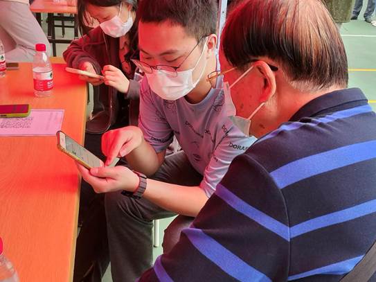 “老师,请您眨眨眼,对啦,现在向右转头,再转大幅度一点,看我这边……不着急,轻轻张大嘴巴就可以了……好了,认证成功。”队员们的热情细心和耐心得到了老同志们的交口称赞。经过两天的努力,志愿者们协助近160名不熟悉智能手机操作的老同志加入了离退休人员服务中心的团体码。