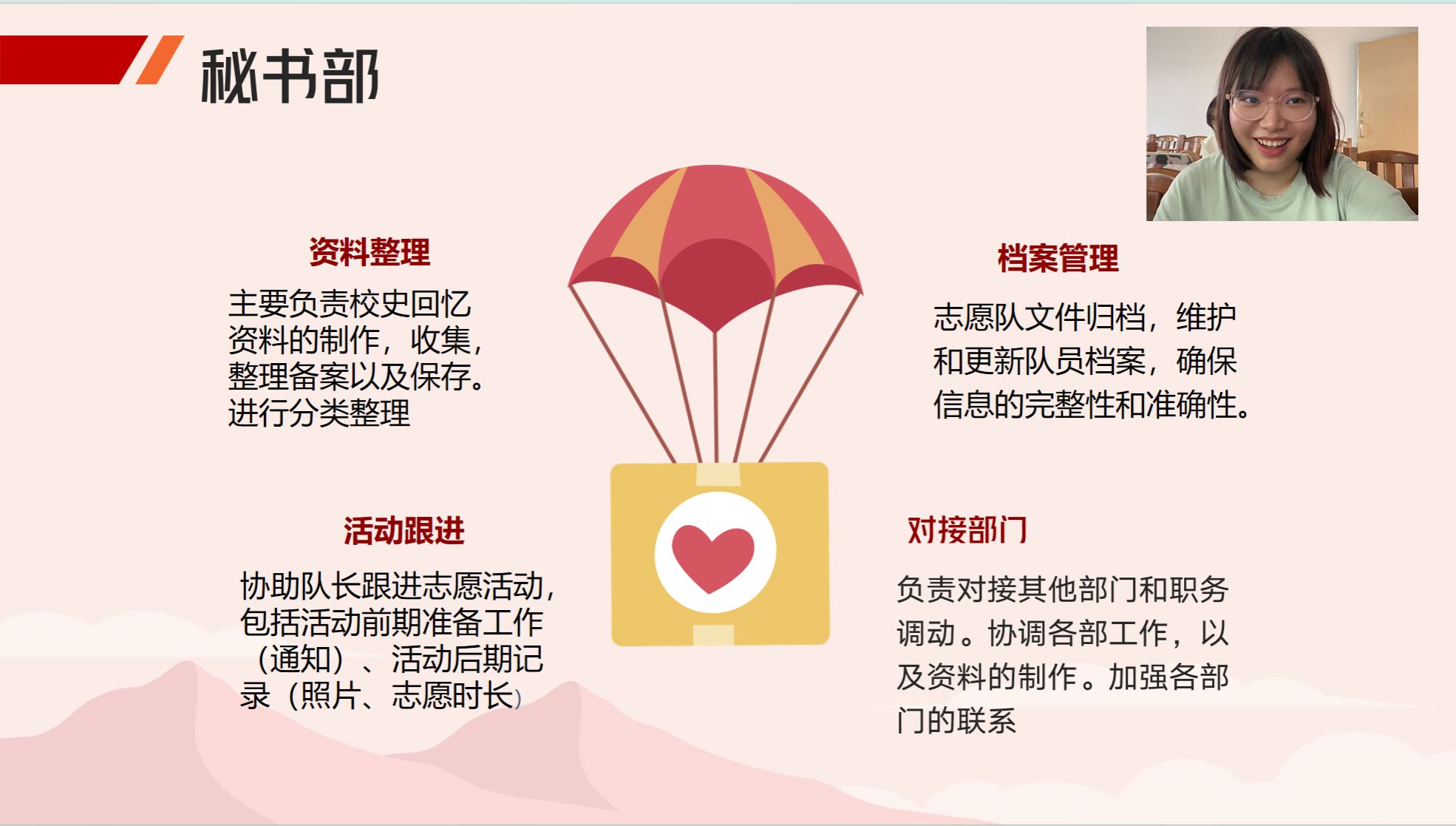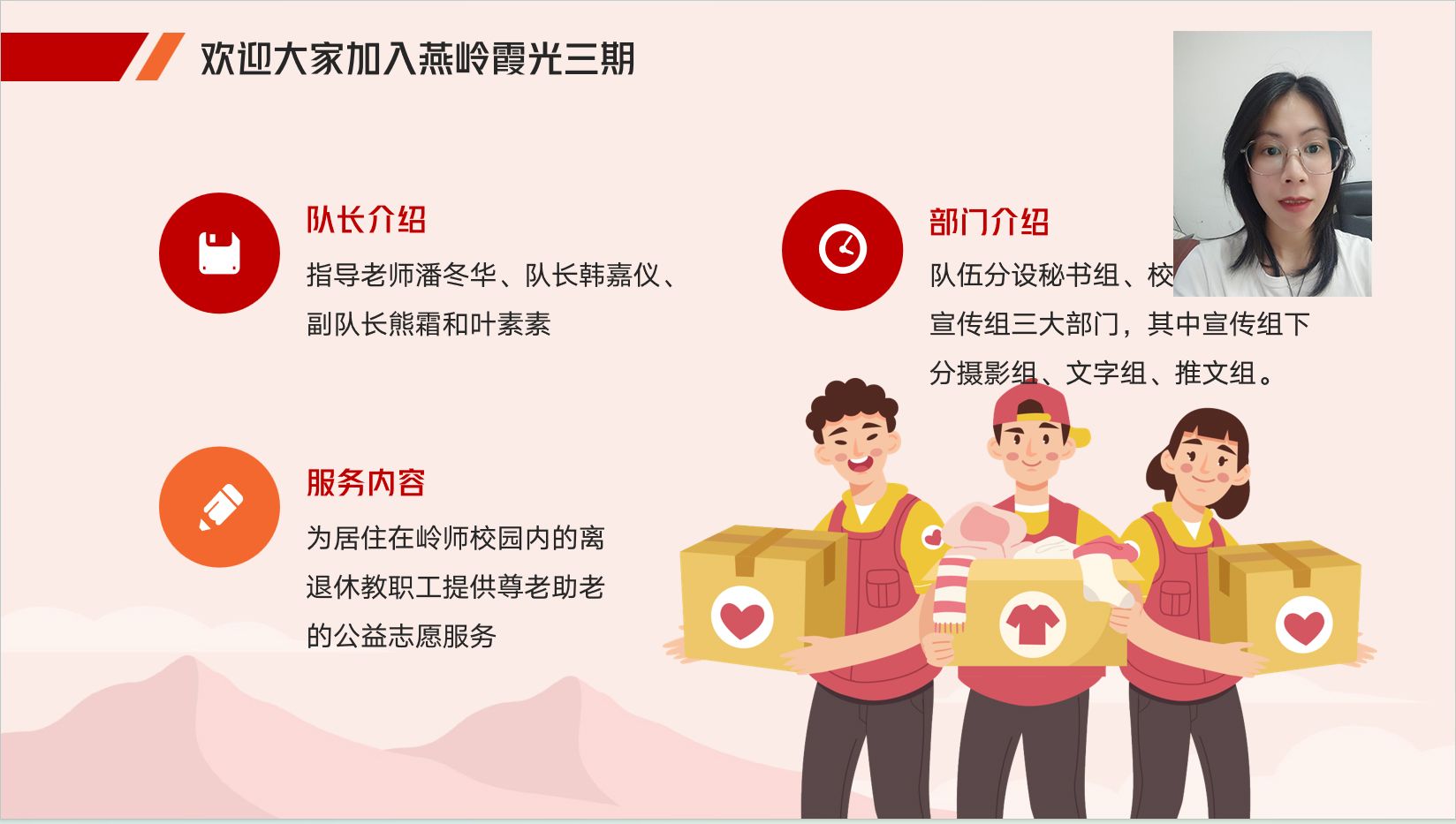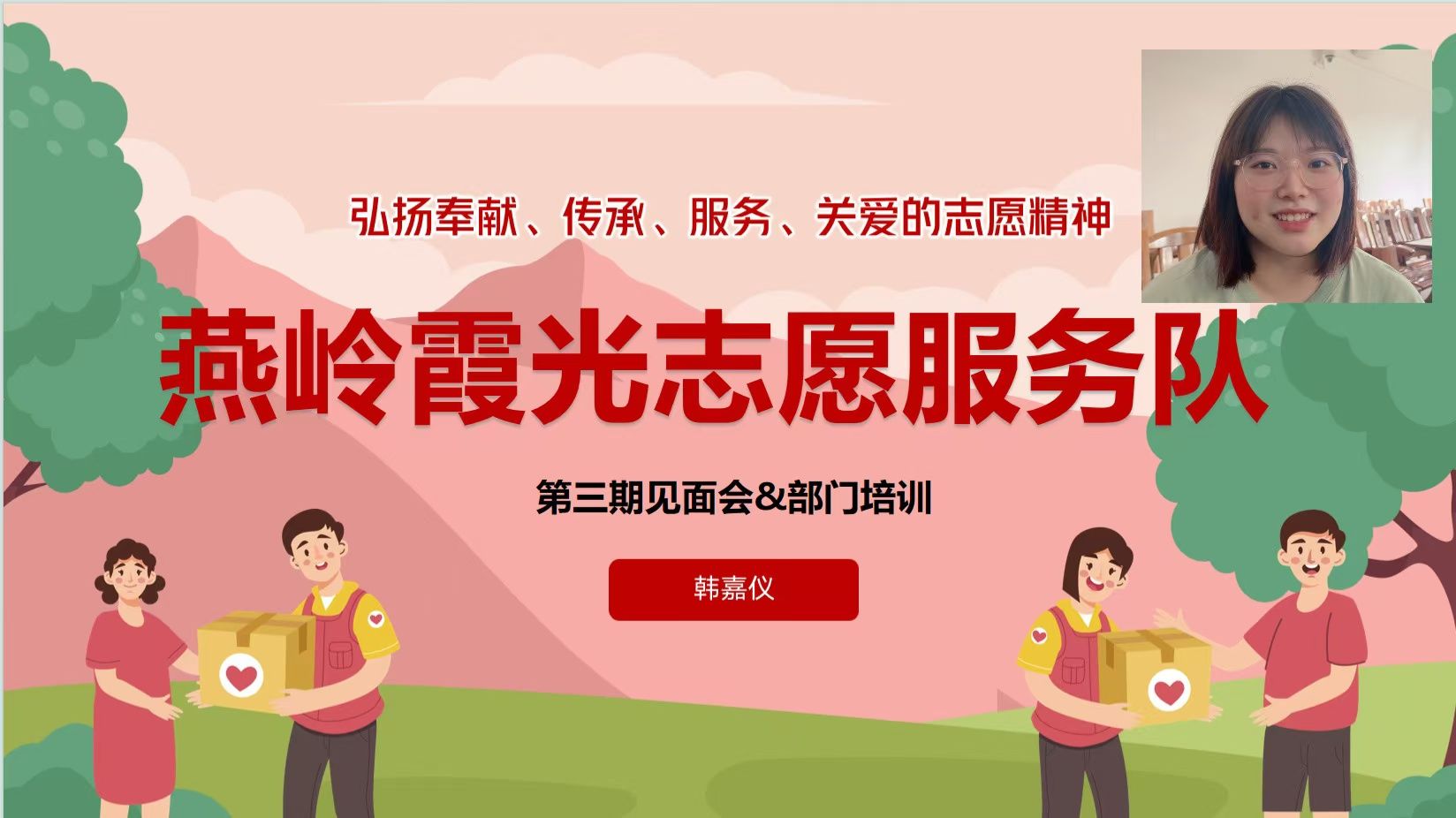 “燕岭霞光”志愿服务队长韩嘉仪作部门介绍及发言