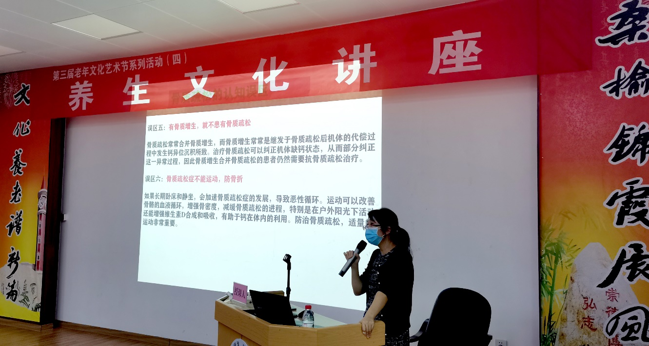 吴肖萍结合老年人群体实际,对骨质疏松症的定义、危害、表现、原因和防治等五个方面进行了深入浅出的讲解。此外,她还重点指出了大家在日常生活中对骨质疏松的认知误区,特别建议平时在饮食上要多摄入含有丰富钙质及维生素D的食物,多进行户外运动,养成良好的生活方式,引导大家清楚地认识骨质疏松。期间,吴医生还为老同志们准备了骨质疏松小测试,让大家对自己的身体有更多了解,提前做好预防和保健。整个活动过程有序推进,现场氛围融洽,广大老同志积极配合,认真听讲,健康养老意识得到了提高。